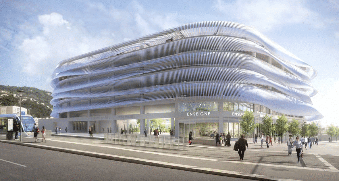 Signé par le bureau In Situ Architectes, on dirait bien que le bâtiment s’inspire du design fluide de l’Allianz Riviera. Façades courbées, lamelles verticales, parois ajourées… Un souffle architectural destiné à transformer un carrefour longtemps dominé par la voiture en un repère « identifiable et accueillant ».